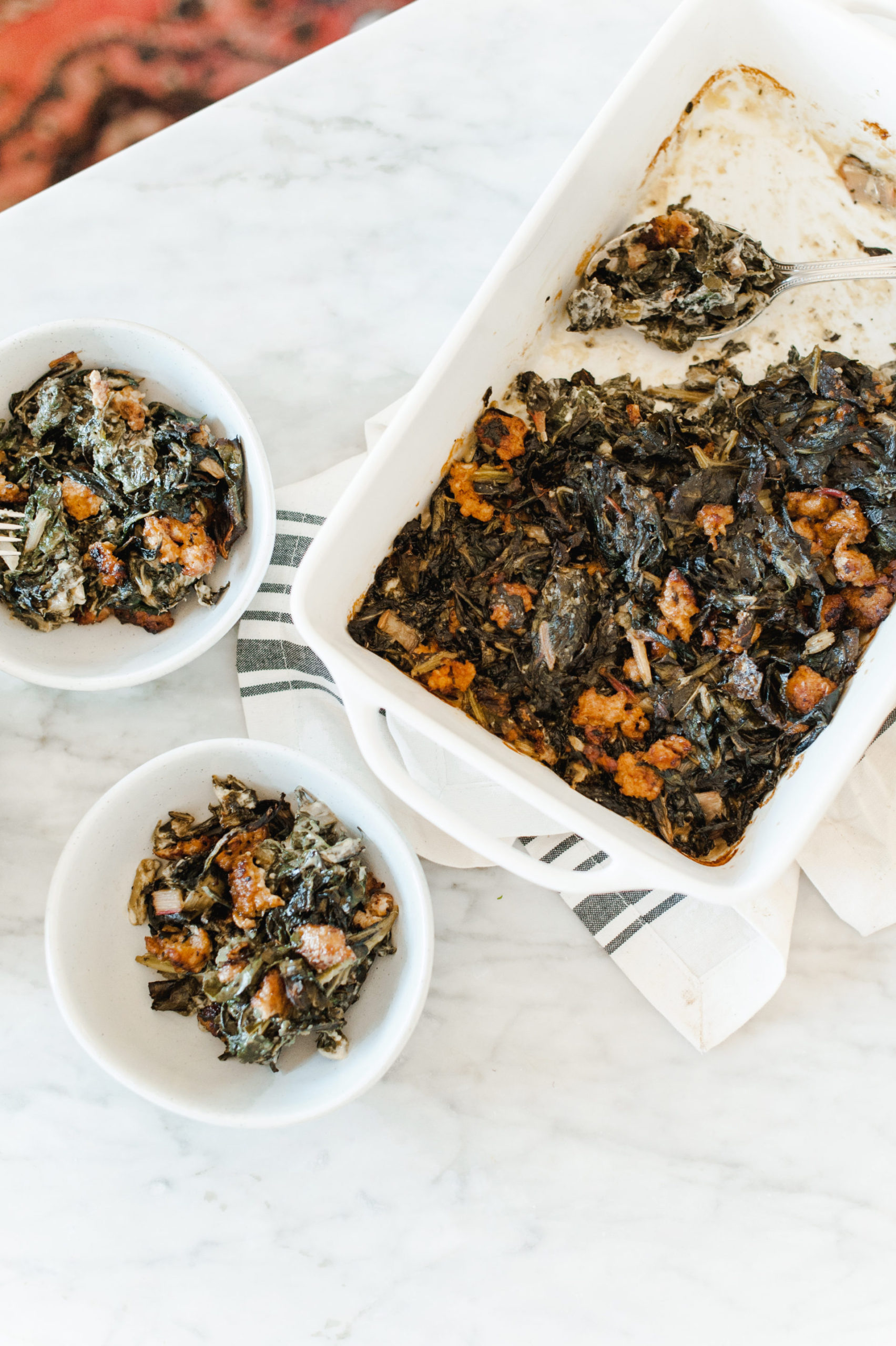 With a cozy one-pot meal that’s always a crowd-pleaser (and sneaky little way to add in more nutrient-dense dark leafy greens to your life). This dish is perfect for having people over, or bringing to a potluck, as it can be made-ahead of time and tastes great served warm or at room temperature. So…. if you were looking for a holiday dish for a crowd… this would be so perfect.